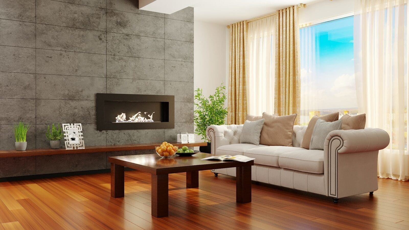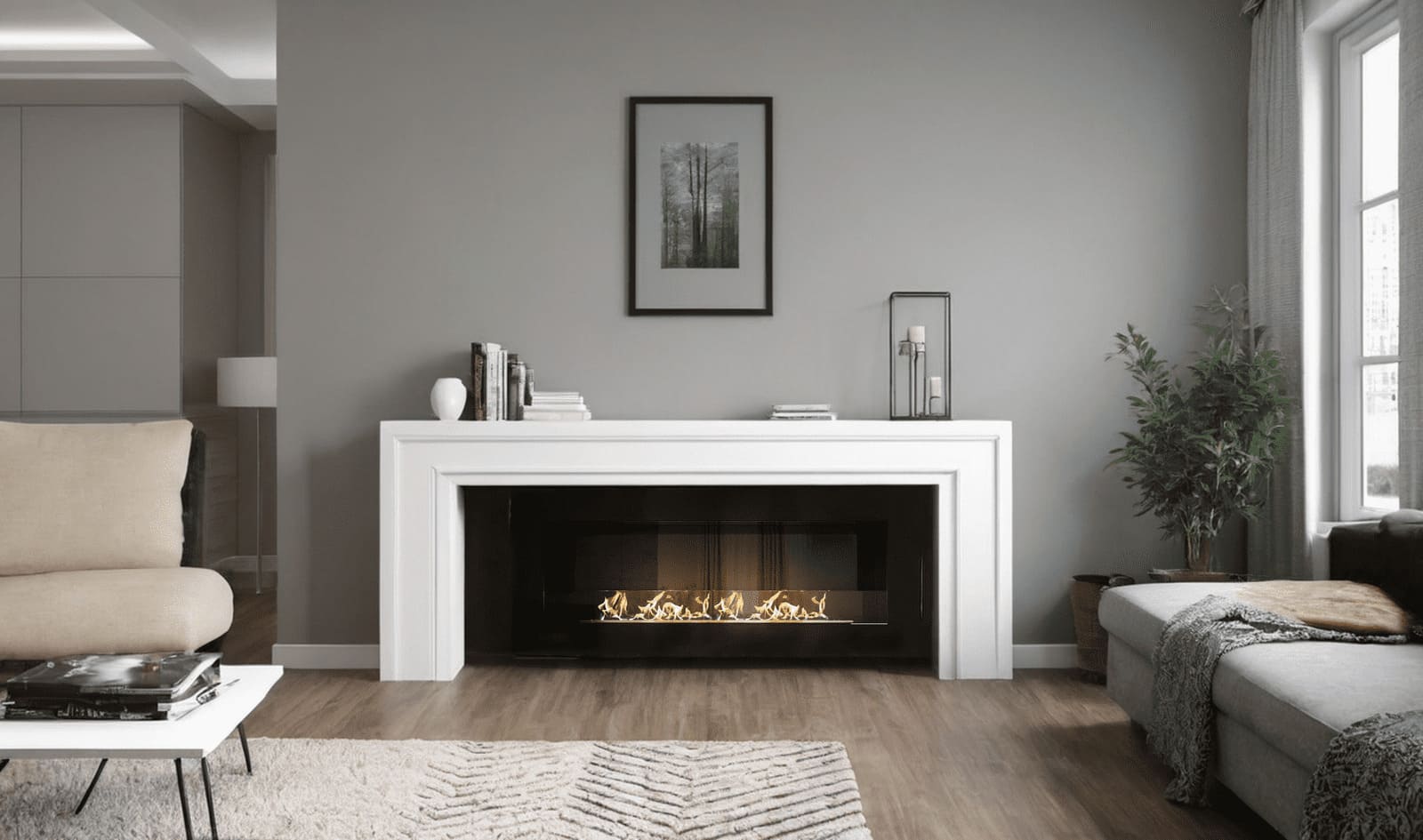 Декоративное стекло — крепится на всю заднюю стенку очага. За счет своего зеркального отражения, пламя визуально становится в 2 раза больше и кажется, что камин горит еще ярче.