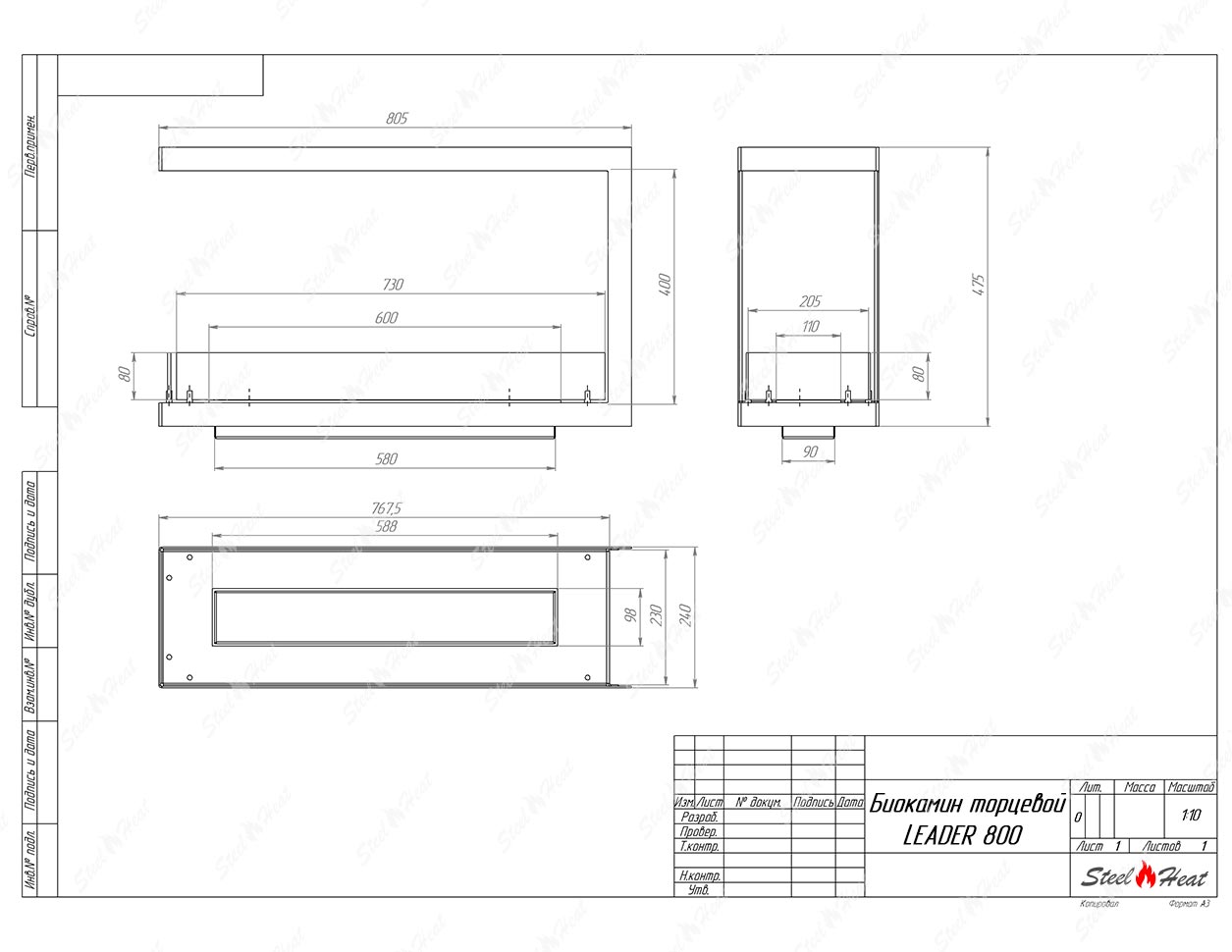 Встраиваемый Биокамин торцевой SteelHeat Leader 800 предназначен для встраивания в глухие ниши из гипсокартона, кирпича, пеноблоков, бетона.
