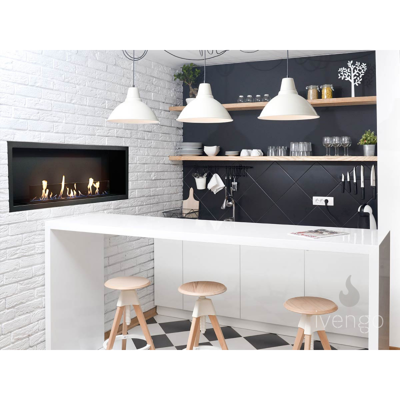 Встраиваемый биокамин Ivengo SLim – одна из наиболее популярных моделей.Благодаря тому, что горелка «спрятана» под днищем, очаг имеет небольшую высоту. Компактная, вытянутая по горизонтали, конструкция не будет визуально «опускать» потолок, как это нередко случается с крупноразмерными экокаминами.