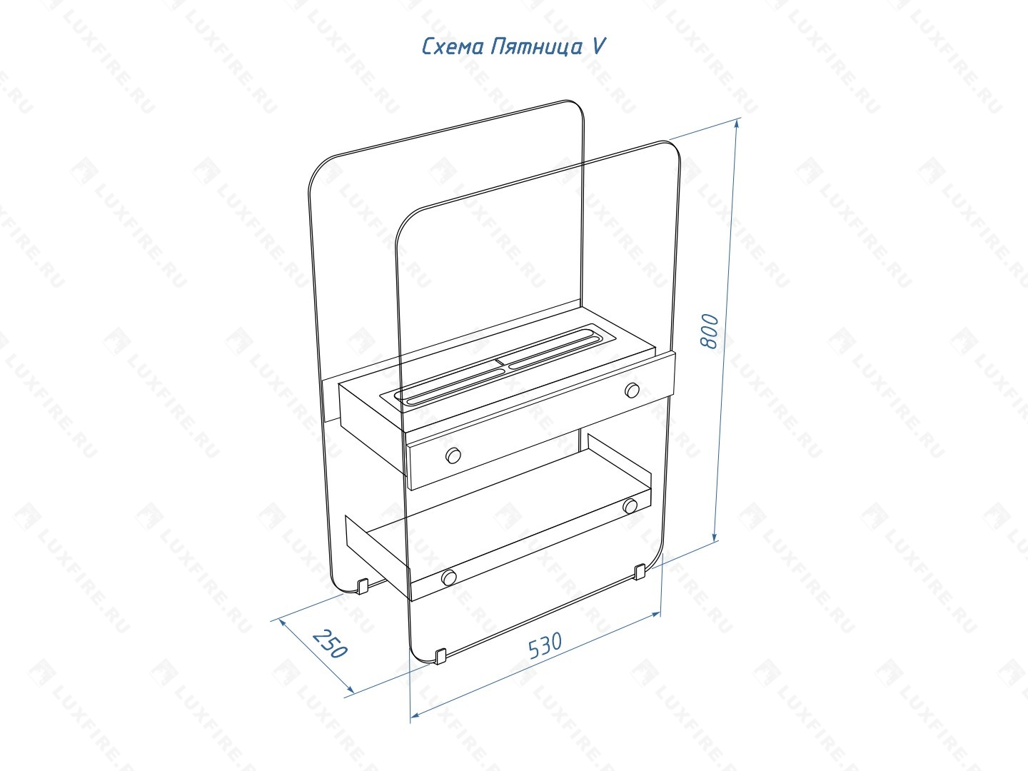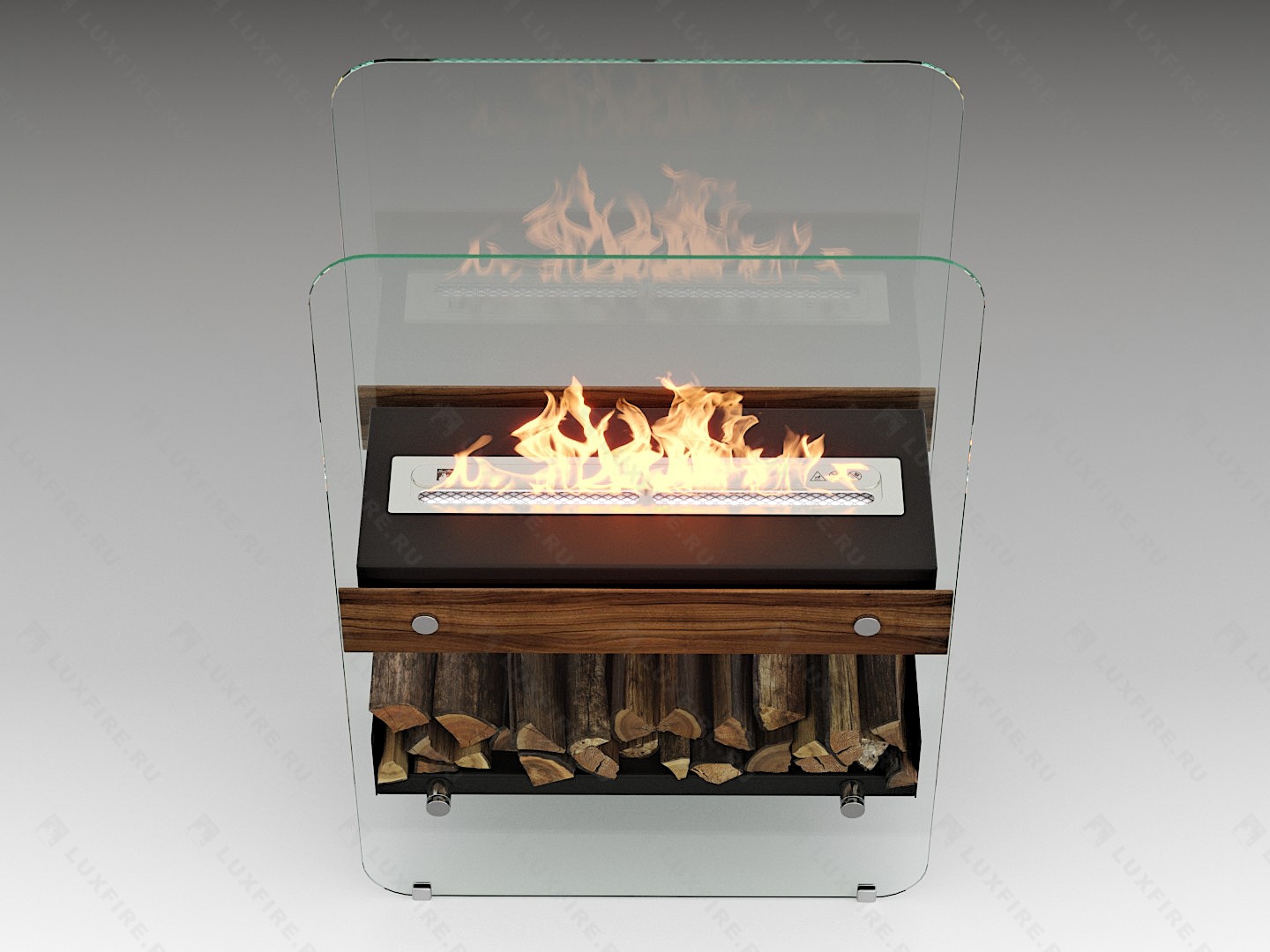 Представляет собой сборную модель оригинального авторского дизайна студии "Vontaren&Grinero" из закаленного прозрачного стекла и топливного блока Luxfire 450 XS на подиуме, закрепленного на 8 дистанционных держателях. С деревянными натуральными накладками и набором дров с дровницей, обработанных огнебиозащитным средством.