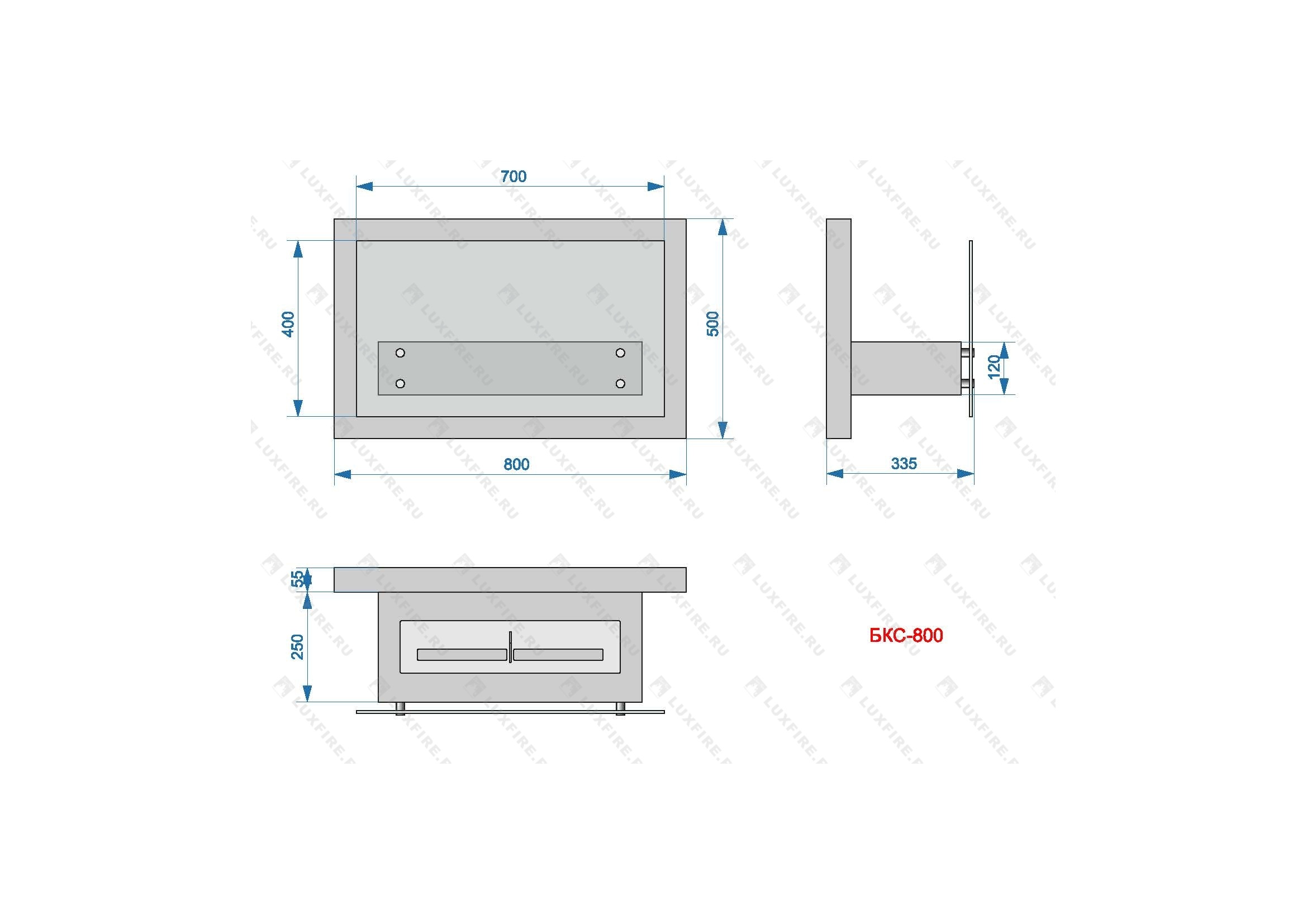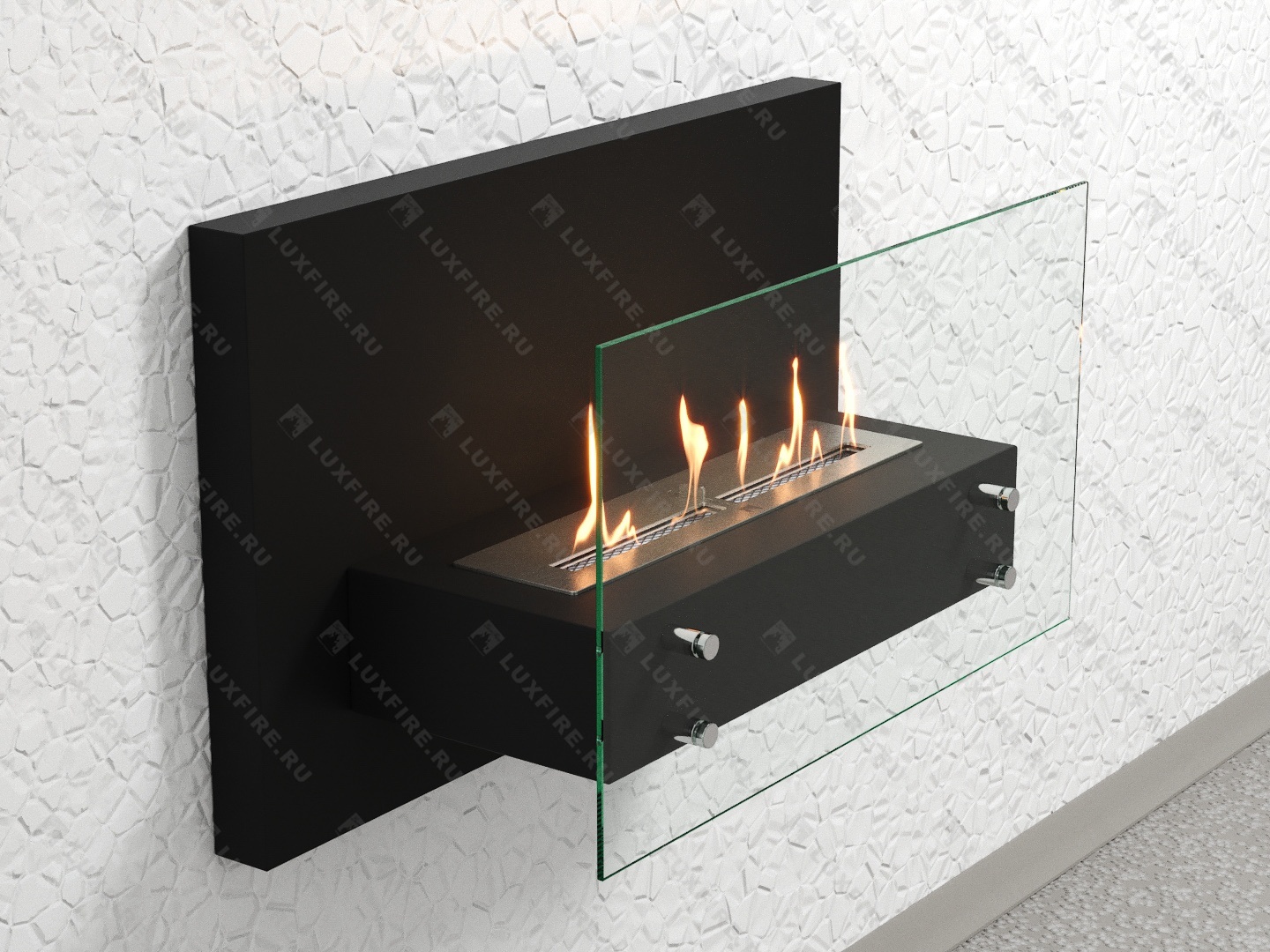Представляет собой сборный металлический каркас с топливным блоком Lux Fire 500 М, закрепленный на 4 дистанционных держателях к защитному стеклу с подвесом к стене.