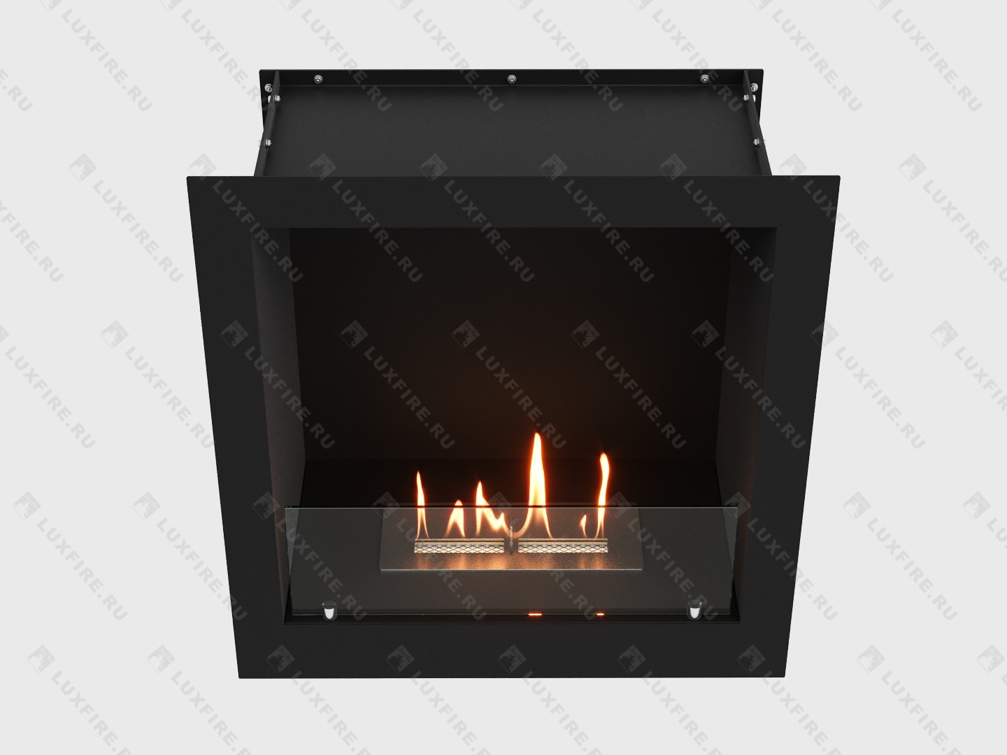 Представляет собой сборную металлическую конструкцию класса М, создающую полузакрытое безопасное пространство для огня с топливным блоком Lux Fire 300М ограниченную закаленным стеклом в котором горит живой огонь с углом обзора 180 градусов .