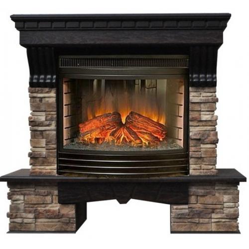 При изготовлении каминокомплекта использованы современные искусственные материалы, отлично имитирующие натуральный камень и дерево. Каркас портала составляет МДФ, отличающийся высокой прочностью, что обеспечивает хорошую жесткость конструкции. Большая часть поверхности портала покрыта искусственным камнем, который имитирует пиленый скальник. Такое покрытие придает изделию основательный и массивный вид. Декоративные элементы и каминная крышка выполнены из МДФ. Детали из МДФ дополнительно покрываются натуральным шпоном, который придает им декоративный вид и защищает от внешних негативных факторов. На выбор покупателя представлено два варианта цвета: темный дуб и венге.