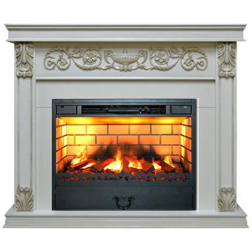 Портал предлагаемого каминокомплекта выполнен с использованием МДФ – современного материала, схожего с натуральной древесиной. Обусловлено это также волокнистой структурой. Благодаря этому МДФ легко поддается резной обработке. При более низкой стоимости МДФ обладает еще одним важным преимуществом – большей устойчивостью к перепадам параметров микроклимата. За счет этого обеспечивается долгий срок службы камина, оборудованного паровым очагом. Защитные свойства материала во многом обусловлены наличием слоя натурального шпона. Также такое покрытие способствует повышению декоративных характеристик изделия, так как имитирует поверхность древесины белого дуба. Благородство конструкции подчеркнуто использованием патины при оформлении декоративных элементов.