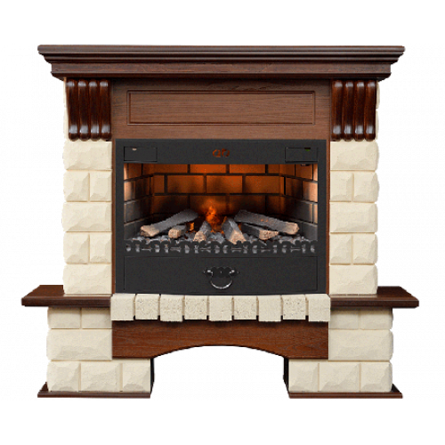 Очаг каминокомплекта при современной конструкции отлично вписывается в оформление такого классического портала. Из декоративных элементов тут стоит выделить оформление ручки зольника и бортик зоны очага. Внутрь встроен Муляж дров и углей, который отличается очень высокой реалистичностью. Во время работы очага они мерцают, что делает их максимально похожими на настоящие Муляж дров. Внутренние стенки очага оформлены под шамотный кирпич, а на их поверхность для придания реалистичности нанесены следы сажи.